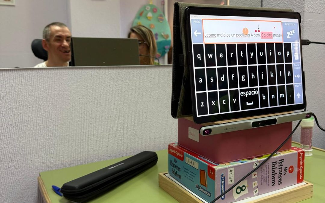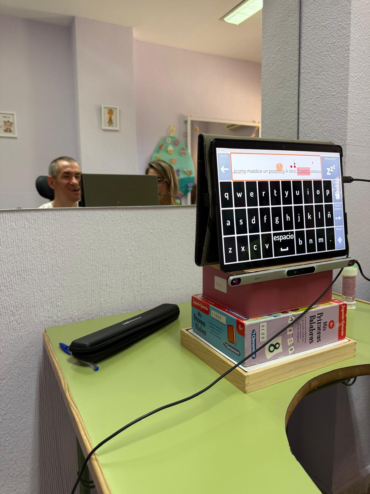 Primer plano de un dispositivo con un teclado virtual adaptado, apoyado sobre varias cajas para elevarlo a la altura adecuada. En la pantalla se muestra una frase escrita. Al fondo, un hombre sonríe mientras se refleja en un espejo junto a la profesional que lo acompaña.