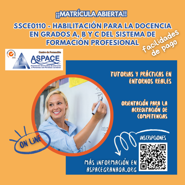Desde el Centro de Formación ASPACE Granada te presentamos la formación actualizada para la obtención del Certificado de Profesionalidad SSCE0110, regulado por el Real Decreto 1697/2011 y modificado por el R.D. 625/2013.
